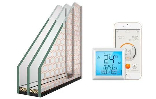 Такой слой наносится с внутренней стороны стекла, чтобы предотвратить контакт с поверхностью и обеспечить безопасные условия эксплуатации. В системах с подогревом устанавливают закаленное стекло. Все это в комплексе обеспечивает удержание тепла в комнатах.