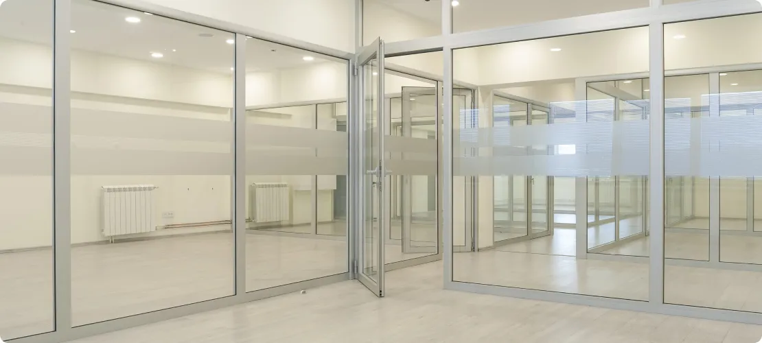 Панели из высокопрочного стекла используют, чтобы разделить пространство в коммерческих и административных зданиях: