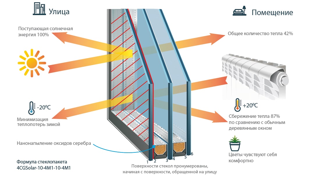 Благодаря избирательному воздействию, тепло и свет беспрепятственно поступают в помещения, а тепло – не выходит на улицу. За счет этого поддерживается оптимальная температура зимой и летом.