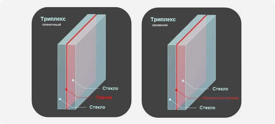 Триплекс представляет собой многослойную конструкцию из нескольких листов, которые соединяются между собой пленкой и полимерный клеевым составом. При этом могут использоваться листы без обработки или закаленные. В последнем случае можно добиться максимальных технических и эксплуатационных параметров.