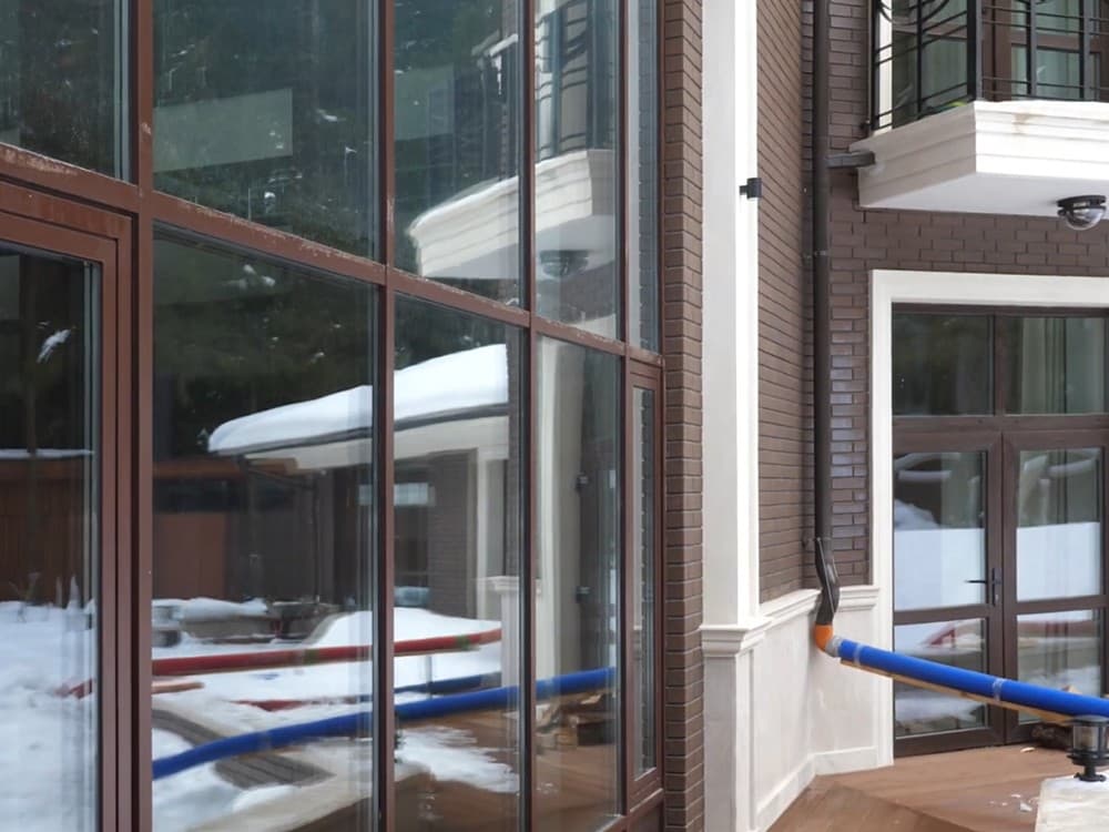 Выполненные работы: Установлено 16 панорамных окон, Ламинация изделий под дерево, профильная система REHAU Delight и Brillant, Остекление 6 входных групп, Противовзломная фурнитура Siegenia Titan AF, Стеклопакет 40 мм с i-стеклом