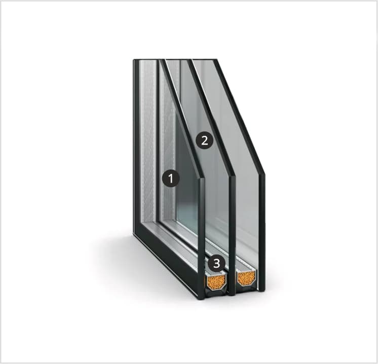 Конструкция представляет собой три стекла, закрепленных в дистанционной раме, между которыми находится две воздушные камеры. Влага, образующаяся в камерах, впитывается влагопоглотителем. В пространство между стеклами закачивается инертный или углекислый газ. Основные характеристики 2х-камерных пакетов: